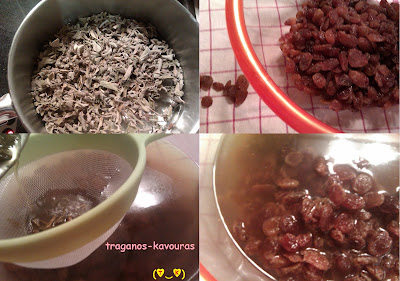 Βράζουμε το φασκόμηλο στο νερό. Σουρώνουμε το νερό σε ένα μπολ όπου έχουμε βάλει τις σταφίδες και τις αφήνουμε να μουλιάσουν για 8 με 10 ώρες.
